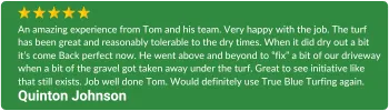 Don't wait to create the outdoor space you deserve! With True Blue Turfing, you're guaranteed expert installation, premium turf, and ongoing support to ensure lasting results. Contact us today for a personalised quote and let’s get your dream lawn growing!
